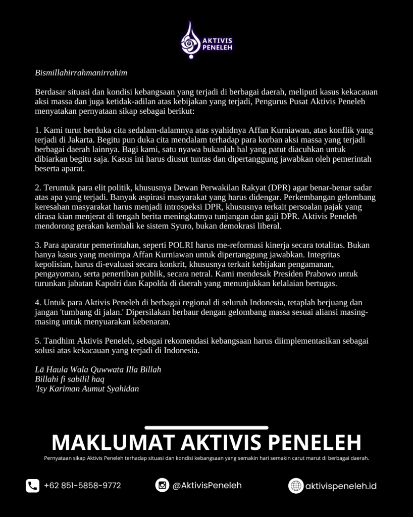3. Para aparatur pemerintahan, seperti POLRI harus me-reformasi kinerja secara totalitas. Bukan hanya kasus yang menimpa Affan Kurniawan untuk dipertanggung jawabkan. Integritas kepolisian, harus di-evaluasi secara konkrit, khususnya terkait kebijakan pengamanan, pengayoman, serta penertiban publik, secara netral. Kami mendesak Presiden Prabowo untuk turunkan jabatan Kapolri dan Kapolda di daerah yang menunjukkan kelalaian bertugas.